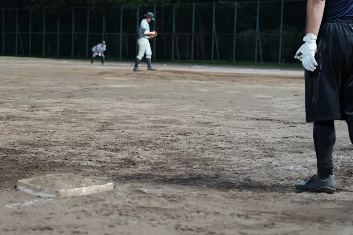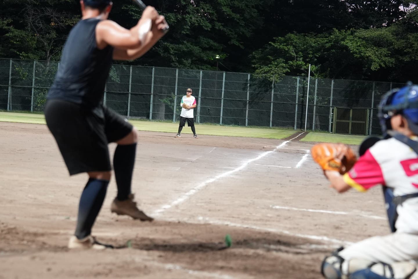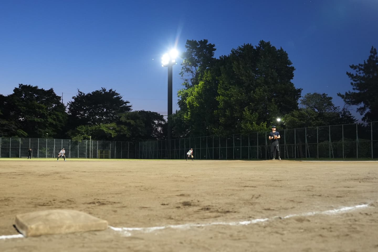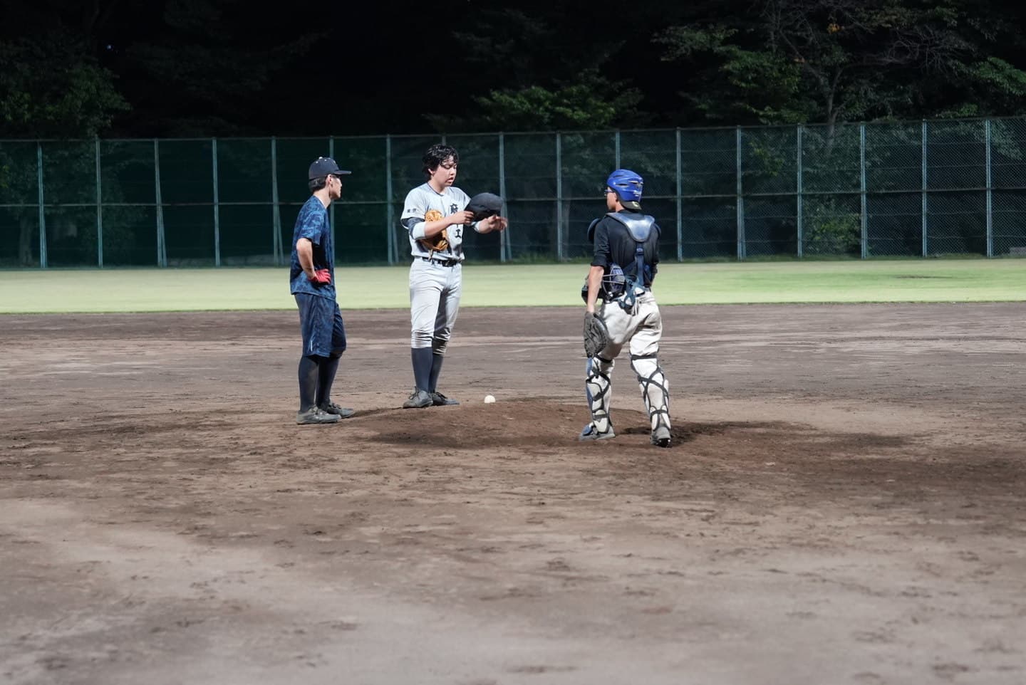 夜でも暑い…汗びっしょりで、泥だらけになりながら球場で野球。夏の高校野球も開催している季節だけあって、みんなやる気満々